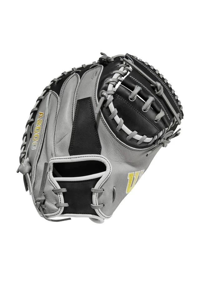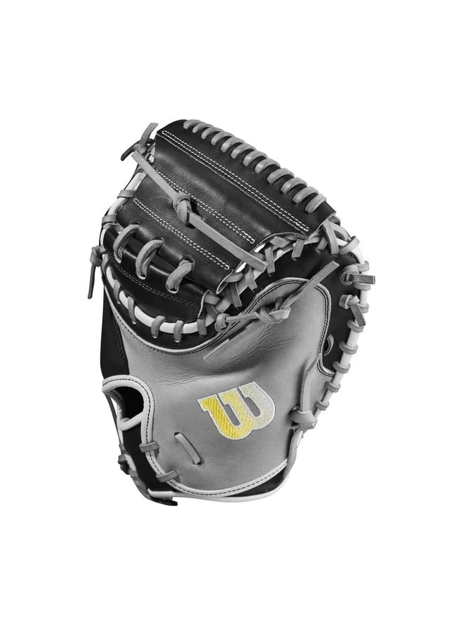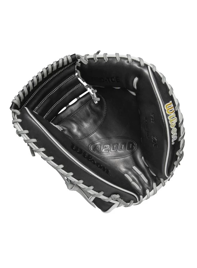 A backstop’s companion behind the dish, the A2000® M2 catcher’s mitt includes integrated thumb protection to help players through the grind of countless pitches in the bullpen or on the field. This 33.5” catcher’s mitt offers the size required to block balls in the dirt while still empowering catchers with the control to frame pitches on the edge of the strike zone. Black and Grey Pro Stock® leather delivers the unmatched feel and relentless durability required behind home plate, and new gradient Bold Logos in Yellow and White bring a modern look to A2000.