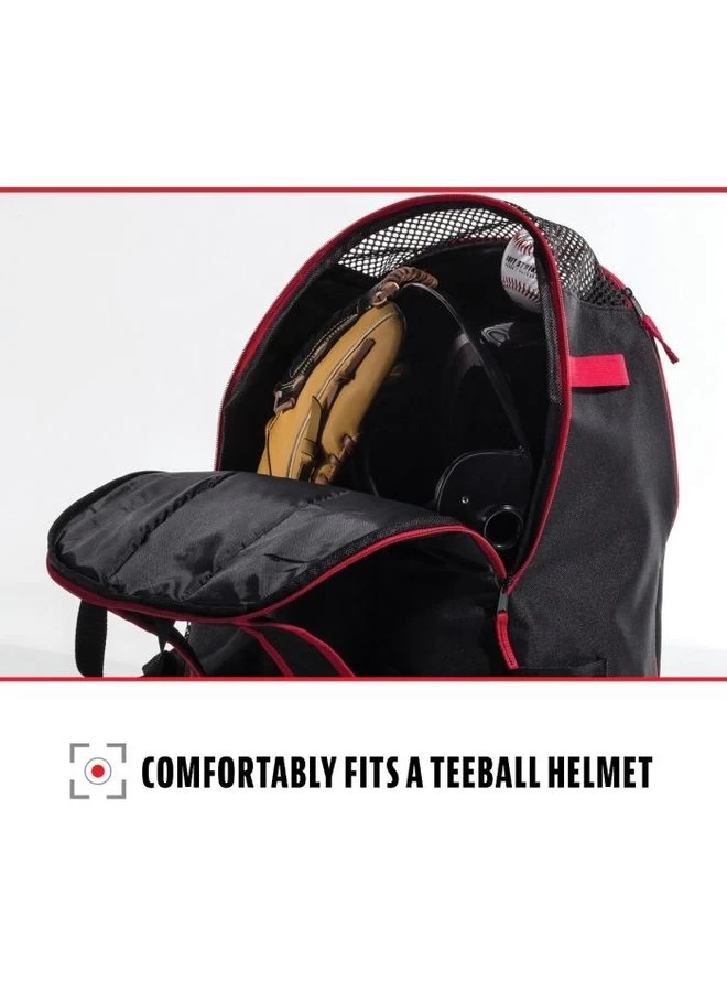 - LARGE STORAGE COMPARTMENT – Spacious main compartment holds baseball helmet with face mask, batting gloves, fielding glove, cleats, and various accessories
