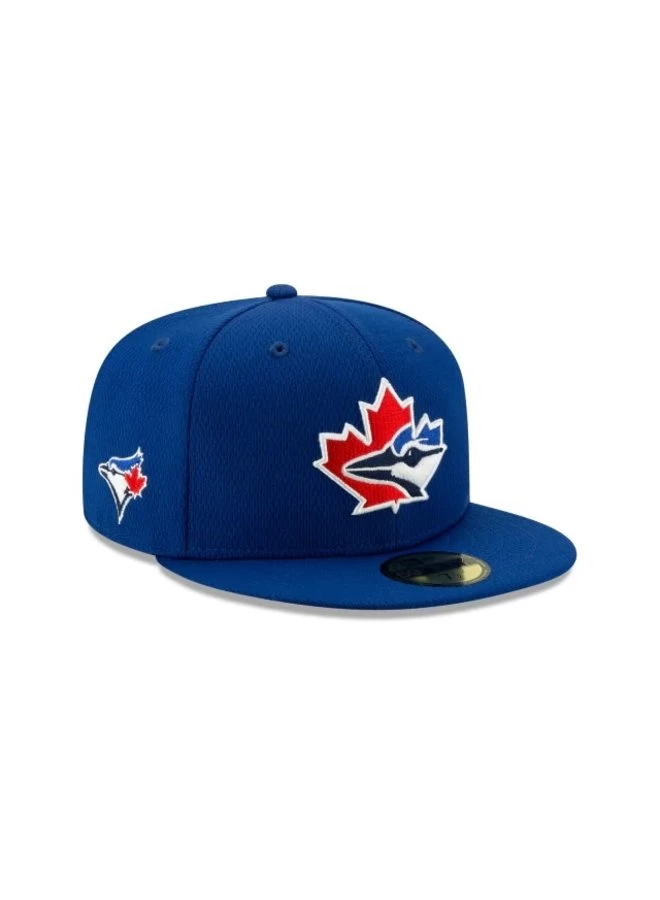 The Toronto Blue Jays Batting Practice 59FIFTY Fitted Cap features an embroidered Blue Jays logo at the front panels filled with an alternate logo that is also found at the right-wear side. Additional details include a team color MLB Batterman logo at the rear.